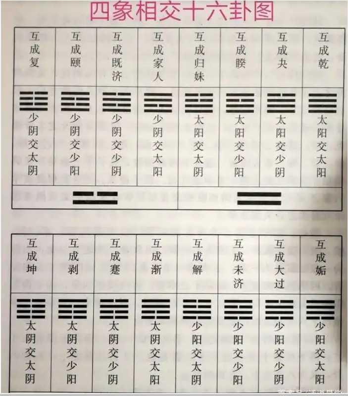 互卦其实是六十四卦的根,初爻各有阴阳,上爻有阴阳,十六个互卦,乘上四就成了六十四卦,十六互卦为根如下图。